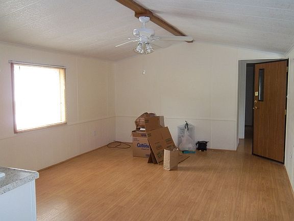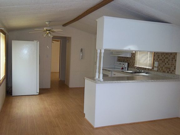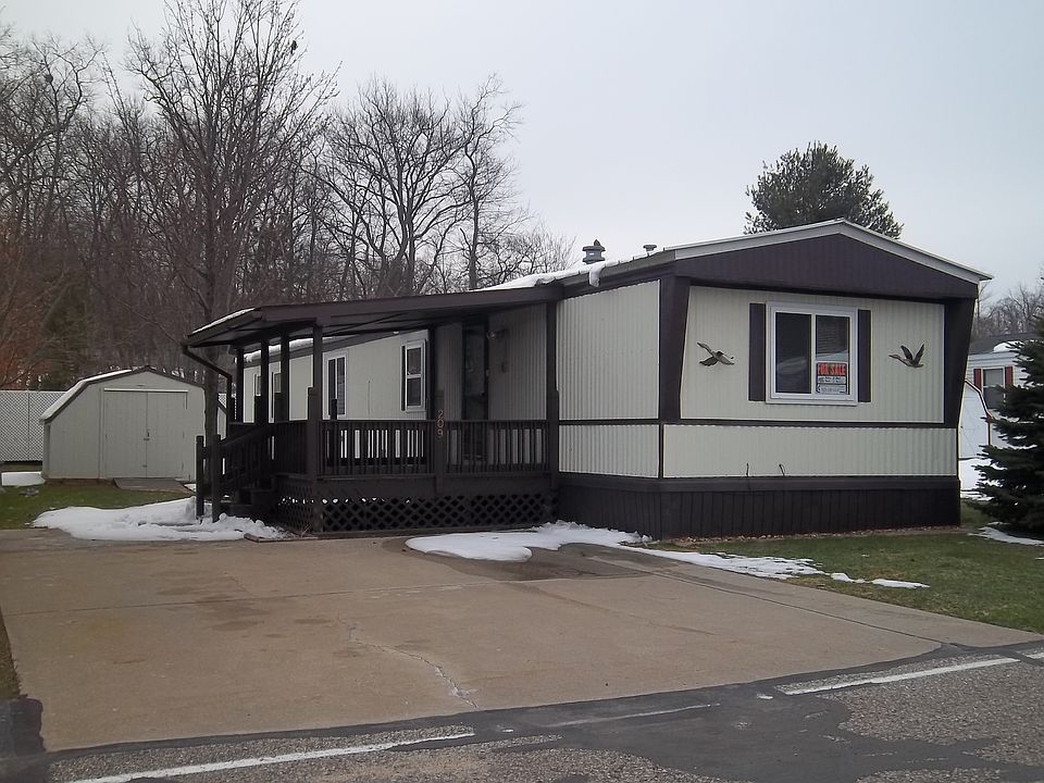 Affordable senior (55 y/o and over) housing in a quiet, well kept mobile home park. Home is tucked into a nicely landscaped lot to provide privacy, reasonable lot rental. Home is 70 ft long x 14 ft wide. Deck size: 10 ft x 12 ft. Driveway in front has two parking spaces with visitor parking steps away. Two small pets are allowed. Come in through the main entrance door to a nice size living room. Left through the galley style kitchen (electric stove and side-by-side refrigerator with ice maker stays) - notice the large built-in kitchen pantry, through a short hall to the Master bdrm with walk-in closet to private three piece bath (toilet, sink and shower stall) and a small storage closet. From the entrance turn right: a hallway to the main, full bath (toilet, sink, bathtub with shower) and second bedroom. The washer and dryer, tucked in an alcove near bedroom, stay. There is a second exit door in the hallway. Many items in this home were replaced/updated a few years ago: Steel roof, newer windows, laminate flooring, neutral paint throughout, ceiling fans in each room (helps lower utilities), KITCHEN base cabinets w/counter, sink and faucet, MASTER Bdrm: freestanding corner shower, vanity with sink / faucet, and high-rise (convalescent) toilet, ceramic tile floor, Main Bath: vanity sink/ faucet ceramic tile floor. Natural gas water heater, forced air furnace with air conditioning (although seldom needed due to lake breezes in summer.) Very large (12ft x 12ft) tool / storage shed for storing lawn mower and tools. Lot rent includes water / sewer and main (circle) road snow removal and general upkeep of the common areas. Homeowner performs lawn maintenance and snow removal on lot site. Conveniently located within walking distance to grocery market, pet grooming business and a number of restaurants. Banks, medical offices, and local farmers market (in summer) nearby. Dial-a-ride is available for local trips if you don't want to walk or drive. Buyer must complete a park occupancy application and be approved.
