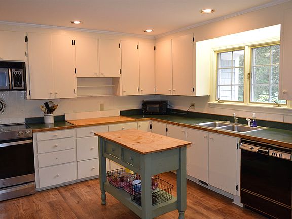 One floor living in this SPACIOUS home. Do not be fooled by the outside of this home, it is larger than it appears from the driveway. Large open concept living room and family room with beautiful built in cabinetry throughout. Three bedrooms with two bathrooms. Large Primary Bedroom Suite to include walk in closet and bathroom with double sinks and step in shower. Lots of closets, storage and space in this home. Large kitchen with tons of cabinets and counter-space. Laundry room off the kitchen. Private wooded backyard with patio for outdoor enjoyment. Two car garage and extra parking on the paved driveway. Storage shed for your outdoor equipment. Come make this your home! Walking distance to beautiful Colby Sawyer College. Wooded lot on a very quiet cud de sac street. New Roof installed Fall 2023 on majority of house, newer boiler and hot water tank Dec. 2021. A diamond in the rough is waiting for you!