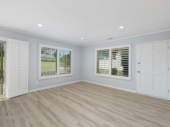 Welcome to this beautifully updated single-story end unit in the highly sought-after 55+ community of High Country Villas. Perfectly situated on the 1st hole of the community golf course and just one block from the clubhouse and pool. Featuring all-new appliances, luxury vinyl plank flooring, fresh paint, updated kitchen and baths, and plantation shutters throughout, this home is completely move-in ready. The spacious open floorplan is filled with natural light, complemented by new LED recessed lighting throughout. The living area opens onto a large rear patio, ideal for indoor/outdoor living and enjoying the peaceful golf course views. Parking is effortless with a detached garage, a dedicated parking spot, and plenty of visitor parking. High Country Villas promotes an active lifestyle with a range of amenities, including a 9-hole golf course, pickleball courts, two pools, a spa, and bocce ball. The lively clubhouse serves as the community hub, offering social clubs, movie nights, and monthly community dinners.
