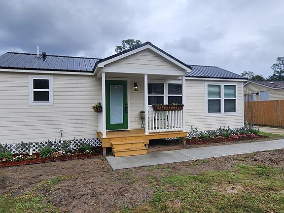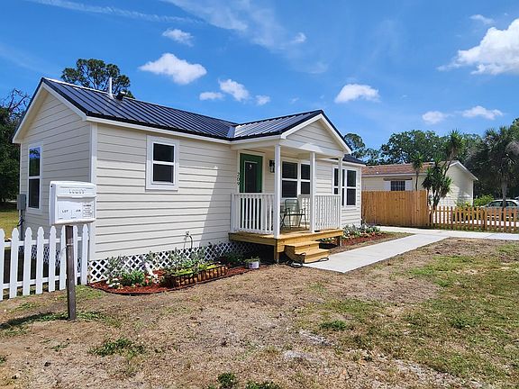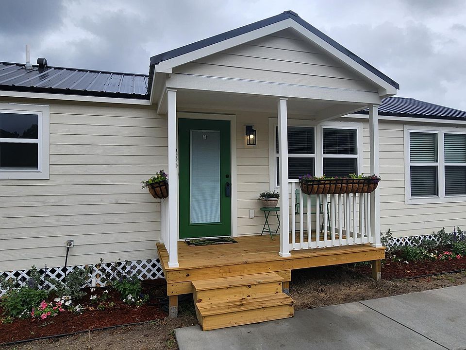 A brand new model has been added to the Peacewind Tiny Home Community, and it's the only 2 bedroom available! Check out this cottage full of character from the fresh landscaping, front porch, to the stunning wood beamed ceilings! No stairs, perfect for easy maintenance at any age with LVP flooring throughout. Upgraded kitchen comes with Quartz counters, soft close cabinets, full size appliances including a dishwasher. Large and luxurious bathroom w/ tiled shower. Washer/Dryer included. Paved driveway and backdoor add to functionality. The lot is 51ft X 91ft deep. This growing community already offers dock & gazebo, banana farm, with much more to come; pool, clubhouse, garden, and trails, start your sustainable living journey now. YOU OWN THE LAND, so come make this house your tiny home.