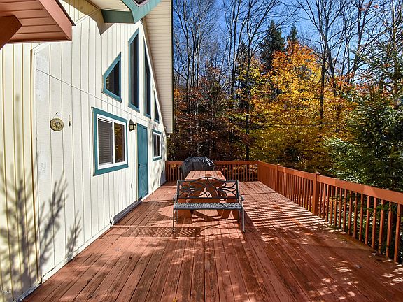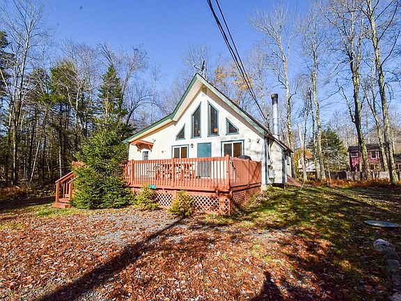 UNBELIEVABLY WELL-MAINTAINED Pocono Chalet Home VERY CLOSE to lakes and beaches in an amenity PACKED community! Walk into the BRIGHT & BEAUTIFUL Sunroom with French doors to the SPACIOUS Living Room with CATHEDRAL CEILINGS & wood burning FIREPLACE. Living Rooms flows right into the UPDATED Eat-in Kitchen with NEW cabinets, pantry, wrap around counter, & STAINLESS STEEL APPLIANCES! 2 NICE SIZE Bedrooms & GORGEOUS, COMPLETELY RENOVATED full Bathroom. LARGE sleeping Loft. Home also features a LARGE front deck with bench. This Home has TONS of improvement like the roof, carpets, sunroom, etc. PERFECT 2nd Home, vacation home, or full time living in cul-de-sac! DON'T MISS THIS! Call Today for a private showing.