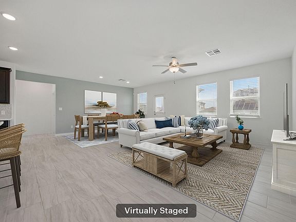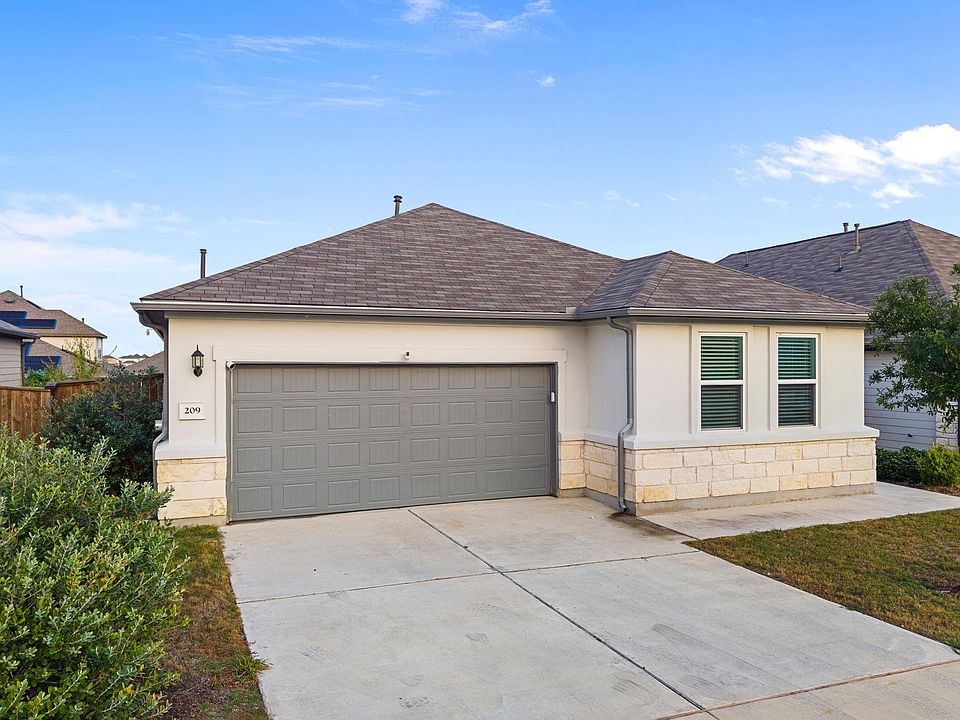 Light, bright and open in the storybook community of Emory Crossing! Stunning four bedroom, one-story home with a great floorplan. An extra-spacious combined living and dining room spans across the back of the home, with the large, open kitchen tying the rooms together. Thick white quartz countertops are contrasted with rich, dark cabinetry, blended with beautiful swirled tile backsplash. Enjoy a large island, huge walk-in pantry and a gas stove as well. The entry hall and main living spaces feature light-toned hard tile flooring, while the bedrooms offer cozy carpeting. A hallway off the entry leads down to three well-spaced bedrooms, a shared bathroom with dual vanity and a big laundry room with shelving. The primary suite is tucked away in the back of the home and is very spacious. The bathroom has a walk-in shower, dual vanity & a fantastic closet. Recessed lighting adds even more light to a home filled with natural light. Unlike new construction, this home comes complete with like-new window blinds and a full alarm system with cameras. The home is also plumbed for a water softener. This is a must see home and community! Nestled quietly behind all the retail and dining found at the Hutto Co-Op.