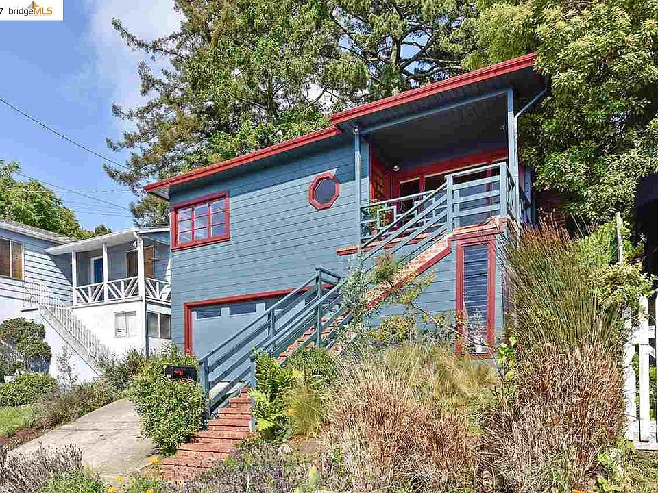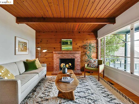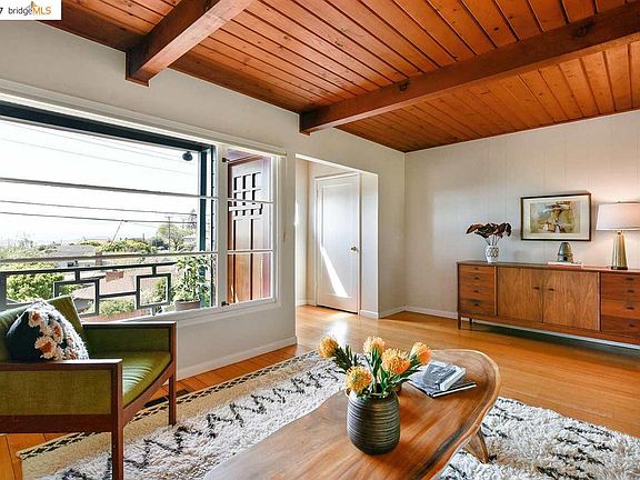 Mid-century and cabin-like, very sweet home with delightful California-style garden. Circa 1952, 2+ bedrooms, oak flooring, beamed wood paneled ceiling, and just a touch of knotty pine. French doors lead to outdoor eating and sitting areas with Bay views. Kitchen with separate nook, skylight, and entrance to yard. Inviting front porch and terraced country garden are perfect for watching sunsets. Corner windows in bedrooms provide good natural light. Classic vintage green bathroom. Plus room has options for guest, office or flexible use. Impeccably maintained. Walking distance to the highly rated Kensington Hilltop Elementary School, Tilden Park, to Kensington shops, and AC Transit.