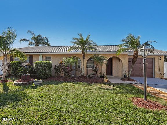 Just a short walk to the beach, this beautifully maintained single-story home pool home offers the perfect blend of comfort, convenience, and coastal charm. This home could also make an amazing Short term rental (STR). 3 bedrooms and 2 full bathrooms, this property boasts brand new floors, fresh paint, and a bright and open layout! Enjoy year-round relaxation in the spacious air-conditioned sunroom overlooking your private in-ground, heated, salt water pool. The pool deck and driveway were just painted! The home is not in a flood zone, connected to city sewer, and comes with no HOA, giving you freedom and peace of mind. Brand new RV Electrical plug. Concrete block home features a Coquina outer finish. Recent updates include a brand-new A/C system and ductwork, ensuring efficient comfort throughout the year. Additional features include electric vehicle charging, and ample space to park your RV and boat. New blown-in insulation and new gutters were also added. Move in ready beach house