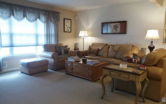 Larger unit with bay window and custom fireplace with granite surround! Beautiful decor, Open floor plan with formal dining room, living room, beautiful eat in kitchen and family room with sliding glass doors to private patio. Attached garage and one outdoor parking space #3. 2 zone heating and air conditioning, freshly painted, newer carpet, hot water heater 1 1/2 years old, newer washer and dryer and fabulous Jacuzzi tub! Many closets and custom closets in the bedrooms. Attic storage, low maintenance $190 month. Walk to NYC transportation. Don't miss this wonderful opportunity!!