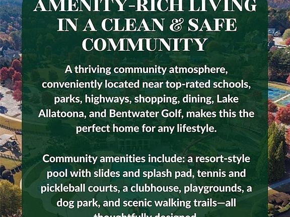 - Features: Clubhouse, Park, Playground, Pool, Tennis Court(s), Street Lights, Sidewalks, Near Shopping