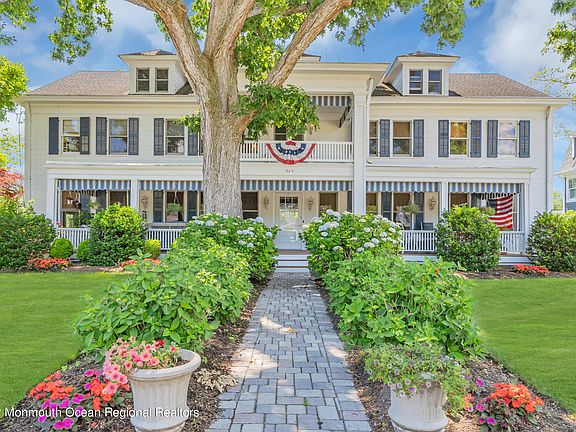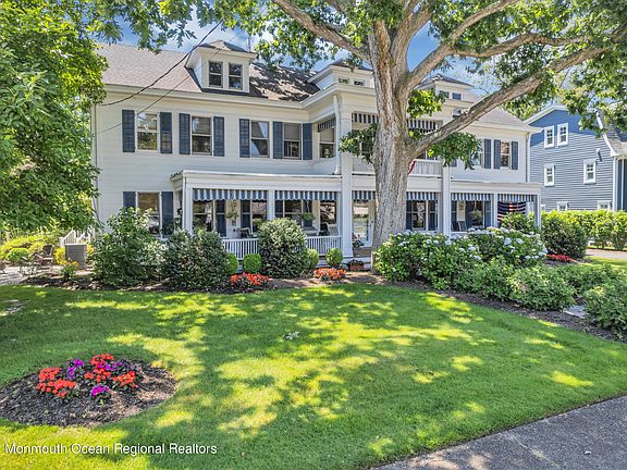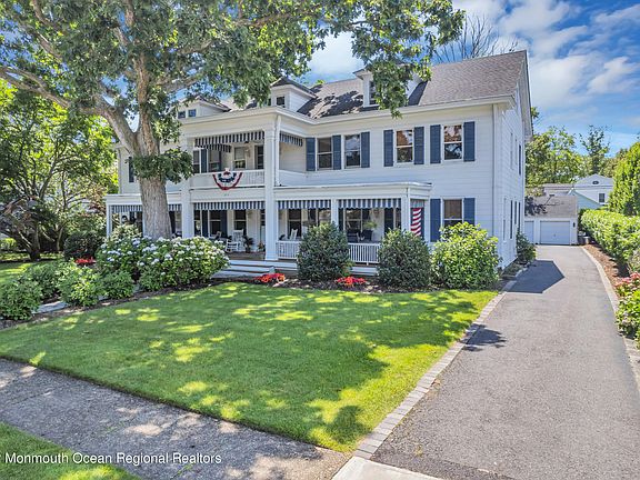 Rare oversized 125 x 150 Spring Lake property on one of the quietest streets in town . Close to beach , parks and downtown. Plenty of room for a pool. Expansive covered front porch with soaring balcony overlooking mature trees and perennial gardens. Three car garage. Charm and elegance abound in this warm and inviting home. A wonderful space for gatherings large and small. Home has been featured in Prime TV series Road Trip Masters . Featuring three stories of living space including a full third floor walkup TV and Billiard Room and Work out area.. Large living room with fireplace. Formal Dining room with adjacent mahogany bar and piano room. Den with built in bookcase. Family room with full bath. Could be downstairs bedroom. Six bright and airy bedrooms.