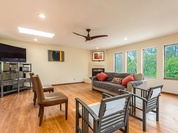 Significant value in a very desirable Santa Fe neighborhood close to shopping, schools, and easy access to Highway I-25. This 2-story home of 3,745 square feet offers 4 bedrooms, 3 bathrooms, 2 living areas, a studio with its own entrance, and an extra bonus room for an office space, storage, or whatever your imagination can dream up! On over 1/2 an acre, this property has a spacious, fully fenced wooded back yard with many pinon trees, 3 champagne apple trees, 2 plum trees, 1 pear tree, rose and lilac bushes, stone walkways, a dry creek bed with three bridges, and a perfect spot to watch the sunset. The main level consists of an open-concept kitchen with great room overlooking the wooded back yard, master bedroom suite with remodeled bathroom, as well as a guest bedroom and a powder room. Downstairs offers a family room with access to a covered portal, two additional guest bedrooms, an office/bonus room, laundry room, and studio space. The roof was restored with a silicone coating in 2017 and comes with a transferable, 10-year warranty. Other features include a high efficiency furnace, on-demand tankless hot water heater, and refrigerated A/C installed in 2015. No HOA! For the buyer willing to invest some TLC to address some deferred maintenance, this property is a great opportunity priced at $177.04/square foot - well below what is typical for this area.