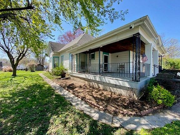 This delightful home, nestled in the heart of Plattsburg, offers a blend of old-world charm and modern conveniences. An inviting front porch welcomes you: perfect for enjoying your morning coffee or relaxing in the evening. The house spans 1,449 square feet and features a spacious layout. There are 2 bedrooms, providing cozy spaces for rest and relaxation. The home boasts 1 1/2 baths, ensuring convenience for residents and guests. The huge living room is ideal for gatherings, while the formal living room adds elegance. Pocket doors enhance the character of the space. Victorian woodwork can be found throughout the home adding a touch of timeless beauty. The spacious kitchen is a chef's delight, with white cabinets and 2 pantry areas. It also walks out to a partially covered deck. A detached garage provides space for your car and more. It even includes heating and air conditioning. The garage also includes a small shop, perfect for hobbies or storage. In addition to the garage, there is a carport at the back of the house. This lovely home offers a blend of comfort, character, and practicality. Don't miss the opportunity to make it yours!