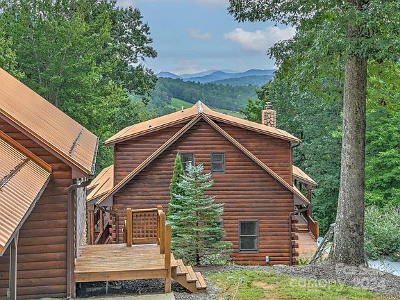 Stunning private mountain retreat tucked away on over 6 acres with expansive, breathtaking views of five different mountain ranges. Live like you're ON TOP OF THE WORLD! This luxury log cabin features over 5000 Sq. ft of living space including a 2nd living quarters &/or in-law suite in the finished basement w/a separate entrance and a massive 854 Sq. ft. finished room over the detached garage. The craftsmanship and attention to detail here are unmatched. You'll find all the beautiful rustic finishes you'd hope for paired with several custom upgrades. Mountain views fill the windows. The great room has soaring ceilings & a stone fireplace. Upscale kitchen w/a walk-in pantry. Primary suite on main. 2 Beds, full bath & Loft area on the upper level. Wrap-around deck & custom patio area to soak up the views & enjoy the enchanting sunrises. Abundant parking w/a long paved driveway, 2-car garage & 2 carports. Convenient to Asheville, the Parkway, Pisgah View State Park & so much more!