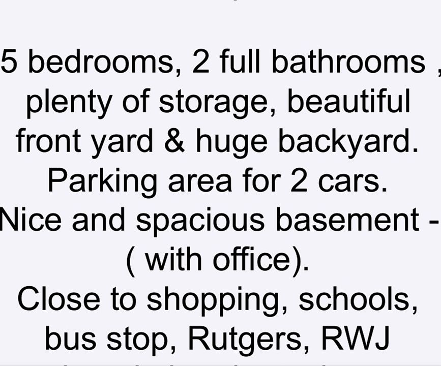 Must see This rental it's for the full House with huge privet yard. this is not apartment. 5 bedrooms, 2 full bathrooms ,plenty of storage, beautiful front yard & huge backyard. Parking area for 2 cars. Nice and spacious basement - ( with office). Close to shopping, schools, bus stop, Rutgers, RWJ hospital, train station. To see the house by appointment only. Available immediately. Renter pays all utilities. Renters must to bring prove of working on the same place in the last 2 years and they are working now. Credit score more than 600.