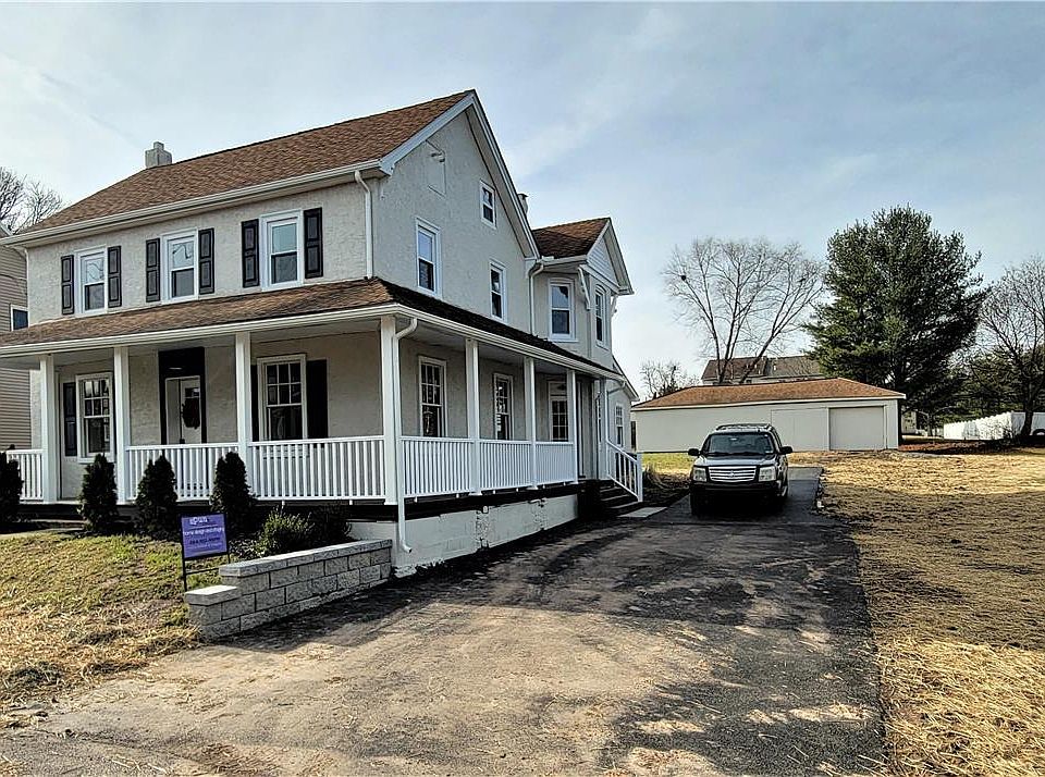 Totally renovated 2500+ SqFt Bucks County Farmhouse w/Wrap Around Porch & Huge Detached Garage in Milford Twp. Obvious attention to detail was paid to this home. Spacious Dining & Living to front left and right give you great space to entertain. Open/airy floor plan w/light spilling in through many windows as you walk throughout. The heart of this home is the roomy Chef's Kit. Oversized Island Breakfast Bar in the center to entertain your guests and join in the conversation while you prepare a meal on your 5 Burner Gas Range. Sliders off Kit open to a Private Patio overlooking rear yard. Kit is also open to a lovely Fam Rm which opens to your Wrap Around Porch. In the rear is a Mud Room, 1/2 Ba, and combination Office/Laundry Rm. Dual stairways! Pie stairs off the Fam Rm lead directly to your MBR w/MBA. Frt stairs lead to 2 large Bedrooms & Hall Bath. Everything's been done. Close to the Qtown Turnpike, & Rt 309 w/all its shopping/eateries within 10 minutes. Come and see it today.