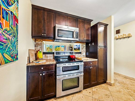 The condo's living area opens onto a private covered lanai with green mountain views. Its corner primary bedroom suite features the breezes and views too. The primary bedroom suite's remodeled bathroom has a shower and stacked, full-size washer and dryer. The 2nd bedroom/office is adjacent to the 2nd remodeled bathroom with a tub/shower combination, creating added privacy for the primary bedroom suite. The kitchen features stainless steel appliances including a new refrigerator with ice and water dispenser.