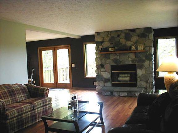 Lake and house on 5 acres. Located at Apple Valley Golf Course just 3 miles from downtown West Branch. This 3320 Sqft, 4 bedroom, 3 full bath Cape Cod home on 5 mostly wooded acres and owns a considerable portion of Crapo Lake. A beautiful stone fireplace anchors the large living room to the dining room and back deck. You'll love the kitchen with stainless steel appliances and slate backsplash, pantry and lots of counter space. The remaining first floor has Owners Suite with full bath and walk-in closet.Bedroom #2, full bath and laundry room.Upstairs find 2 large bedrooms w/walk-in closets and full bath. The lower level walk-out has a free standing wood stove, large family room, storage room with mechanicals and a room that could be a work-out room or media room. Use your imagination. Andersen Windows, fiberglass entry door, fresh paint and new carpet makes this move-in ready. Enjoy the private lake for fishing, waterfowl,& wildlife abounds, rolling hillsides and babbling creek.