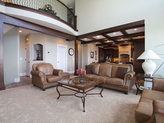 This unique custom home has been specially designed for entertaining and to maximize views. Multiple ceiling heights offers volume throughout with 9' main floor height and an 18' Great Room Ceiling along with a 10' basement and 12' high Theater Media Room. Great room and Master Bedroom feature push button mechanical blinds. Whole house audio system and security cameras. Granite counter tops, custom cabinets with decorative hood, apron farmhouse sink, spice pull outs, double ovens, under cabinet lighting, pot filler and gas cooktop as well as a hidden walk-in pantry make the kitchen shine. The master bedroom boasts decorative trimwork and large view windows. Walk-in shower with 6 heads and bench along with the soaker tub, spacious walk-in closet with custom shelving, and led back-lit mirror complete the master bathroom. Main floor living with a front formal room. Maintenance free Trex Deck features built in Kitchen-Aid grill. Cold storage under the front porch. A real gem.