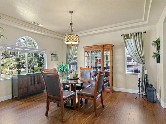 Come and enjoy the lifestyle you deserve in the sought-after La Contenta Golf Course community, just minutes from the serene waters of New Hogan Lake. The pristine and hard to find single story home offers 4 bedrooms, 2 full bathrooms, and indoor laundry room and spacious 3 car garage/ bar area as another option for entertaining. All on a generous half acre-lot. As you enter, you'll be welcomed by stylish arched doorways and durable laminate flooring that flows through out the open concept living space. The layout includes a flexible 4th bedroom or office, a formal dining area and large great room with cozy fireplace, and easy access to backyard patio. The beautiful updated kitchen designed for both everyday living and entertaining, featuring a dining bar, breakfast nook, and sleek stainless steel appliances- including a built in electric oven, microwave, dishwasher, and a free standing gas range. The oversize primary suite is a true retreat with it's own fireplace, private patio access, an ensuite bathroom offering dual sinks, a soaking tub, stall shower, and large vanity area. Outside, the home features well-kept front and back yards equipped with automatic sprinklers. The backyard includes mature trees, raised garden beds, and Shed. Don't miss this incredible opportunity!