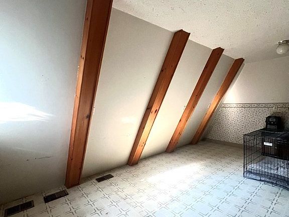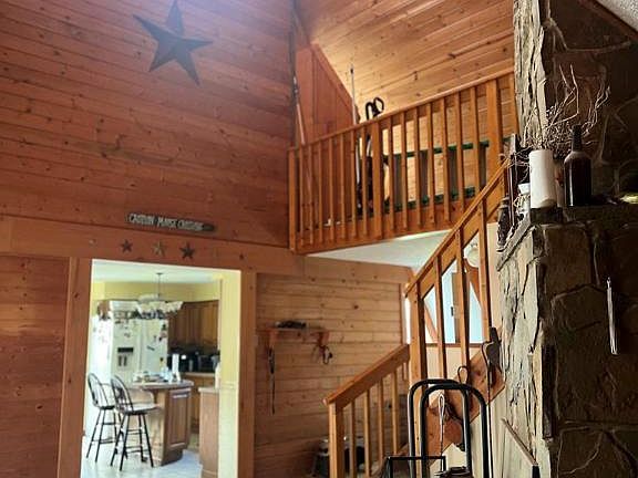 Unique A-frame featuring a Grand Room w/ an incredible custom stone chimney, cathedral ceilings, and exposed beams! The open staircase and upper balcony give this home an overall magnificent feeling. Privacy, space, & potential to become even more!