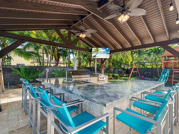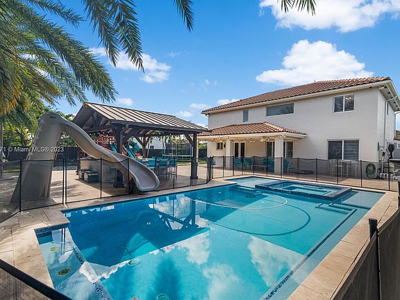 Contemporary elegance defines this stunning residence featuring sleek white porcelain flooring. Junior suite with en-suite bathroom,2 additional bedrooms and a full cabana bath located on the 1st floor. The modern hardwood kitchen boasts granite countertops and stainless steel appliances. Ascend to the 2nd floor where the master suite beckons with its en-suite bathroom showcasing double vanities, shower, modern tub, and closets with built-in organizers. Three generously sized bedrooms on the 2nd floor. High-impact windows and doors, along with plantation shutters, adorn every room. Outside, indulge in an entertainment haven with a pool, water slide, and an outdoor kitchen featuring a built-in-grill,griddle,sink,fridge, and wine cooler. Ample side yard space allows for boat or RV parking.