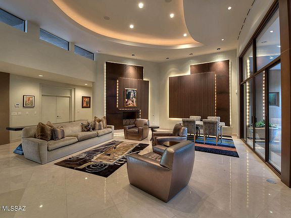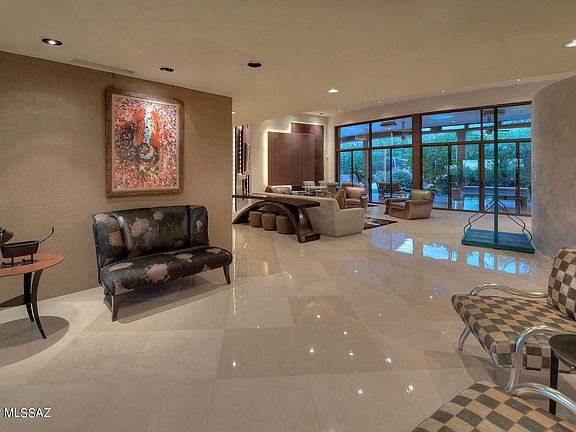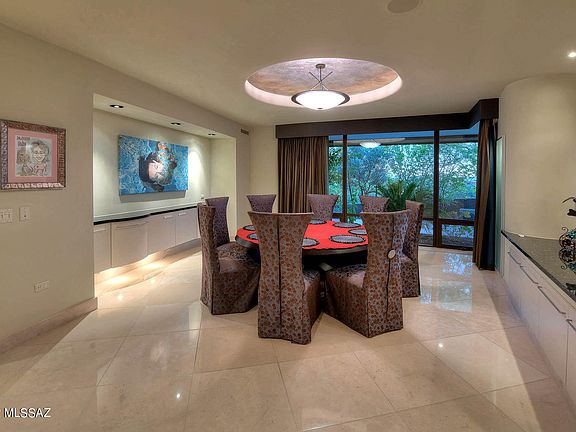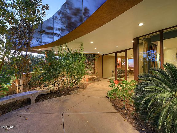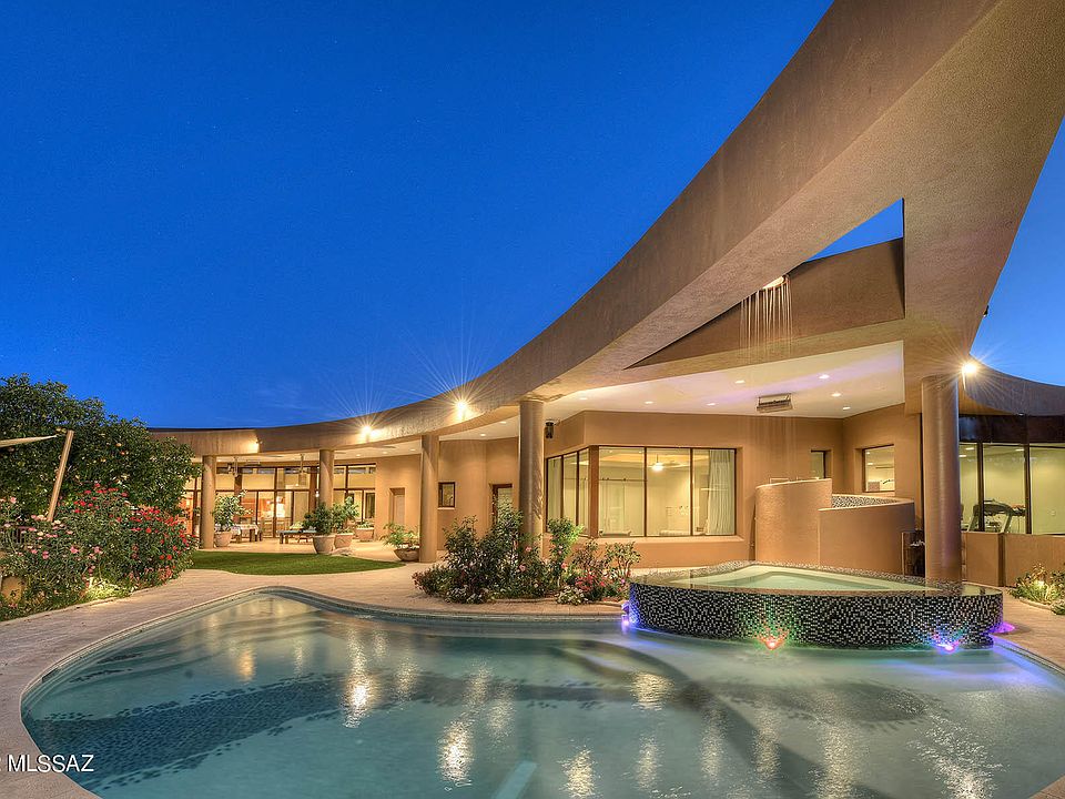 A stunning and architecturally significant contemporary home, designed by award-winning architect Ron Robinette with nods to Frank Lloyd Wright, I.M Pie and Frank Ghery as envisioned by the owners, located on a 1.1 Acre private lot in the prestigious upper double-gated communities of Pima Canyon Estates, is now available for discerning buyers. Interiors were designed by renowned interior designer Lori Carroll, featuring the finest of materials from around the world. This six-bedroom home offers 9,825 sq. ft. of living space, 676 sq. ft. covered entry, 1,877 sq. ft. of covered porches, a 4 car 1,428 sq. ft. garage and 13,806 sq. ft. under roof. Expansive curved glass walls of windows frame the Catalina Mountains as the desert changes seasons and time from a clear sunny day to the glorious sunsets and evenings filled with stars seemingly close enough to touch. The structure illuminates the breathtaking views of the Pima Canyon Mountains in harmony and at peace with nature.