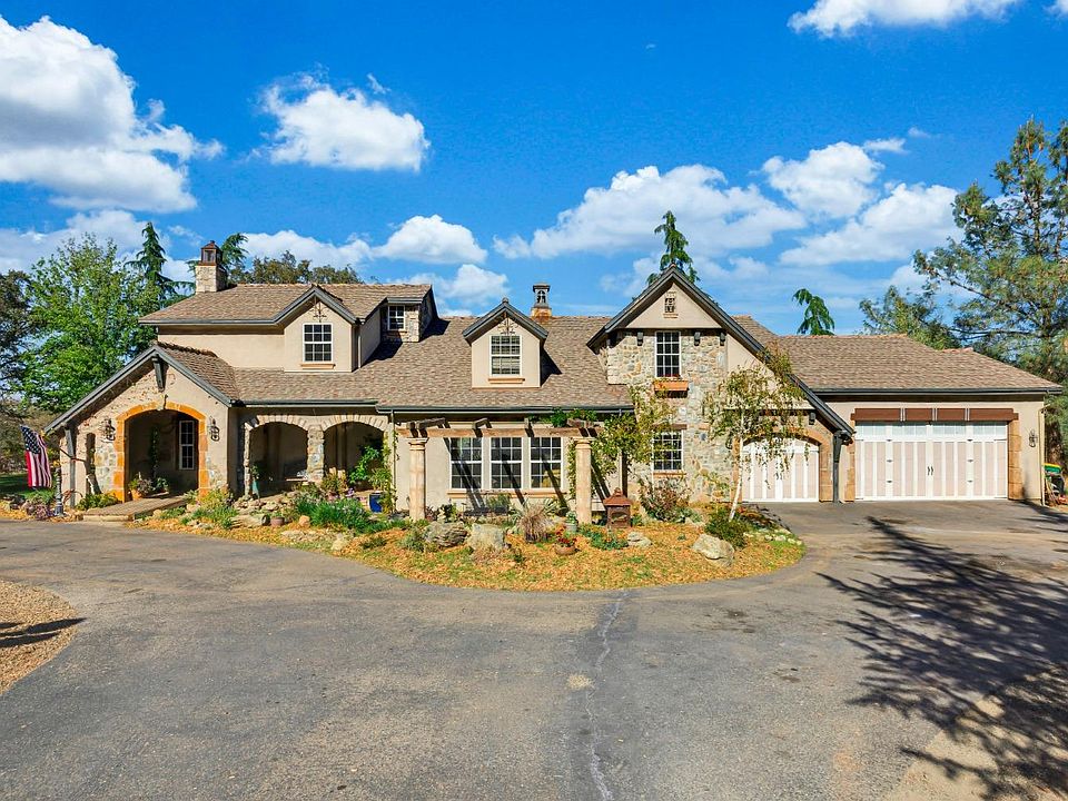 Rare opportunity to join the historic gated community of Green Springs Ranch. Newly reduced price for this custom country estate accounts for market changes and allows the new owners ability to personalize the home w/ updates of appliances, paint, flooring. A one-of-a-kind investment opportunity! Ideally located in Rescue boarding El Dorado hills. Just minutes to town amenities and hwy 50. Designed and built by previous owner and well-known architect Mark Gomm, this 2story country house, nicknamed Storybook Home" by neighbors. The 3458 SqFt home custom estate located on 5 level, usable acres include: stone, wood, tile + venetian-inspired plaster + a floorplan for today's families: Everyone can spread out in luxury + each still have their own space. 4 of 5 poss. BRs upstairs. 1 full bath + powder rm on main. A Grand Owner's Suite: Fireplace, lounge area, sliders to a balcony with views + enormous, extra-deep walk-in closet. Gaze from the balconies across back of home overlooking hill + valley views; gazebo; mature grape vines drape fenced-in garden; play area. Fenced for livestock, chickens, equestrian. 5-car pass-thru garage. 5 min to Folsom Lake. This home is in the school attendance zone for Oak Ridge High School and part of the El Dorado Hills Community Service district.