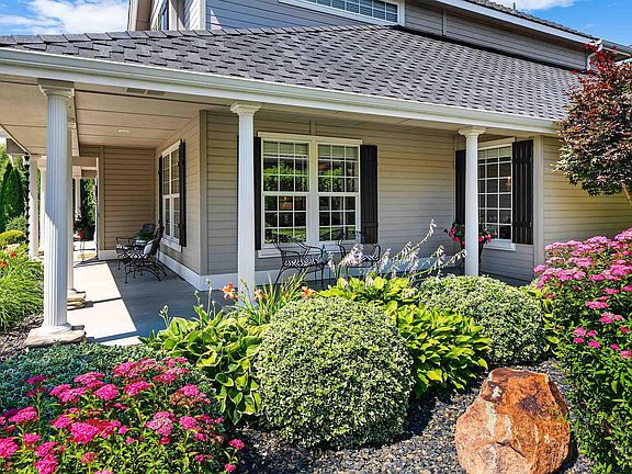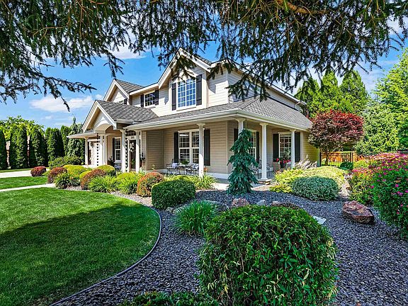 This elegant and pristine home is poised on a gorgeous lot with a private backyard in the tranquil and coveted Lexington Hills neighborhood of Eagle. Enjoy miles of beautiful walking paths with stunning waterfalls, streams, and stocked ponds. Light-infused and spacious, this home features an amazing wrap-around porch, fine millwork, gracious two-story foyer, elegant living room, great room with a raised-hearth gas fireplace, large chef's kitchen (double ovens, 5-burner gas cook top, refrigerator, island, pantry, desk), spacious formal dining room, fabulous primary suite (large closet, shower, garden tub, & dual vanities), main-floor office (or bedroom), large bonus room (or bedroom), laundry room with sink, and four car garage. Enjoy central vac systems (interior & garage), security system, and 220v in garage & patio. Extremely well-maintained home with newer furnace & AC ('22), freshly refinished hardwood floors and sumptuous carpet ('22), roof ('14), solar attic fans ('21), & so much more. Welcome HOME...