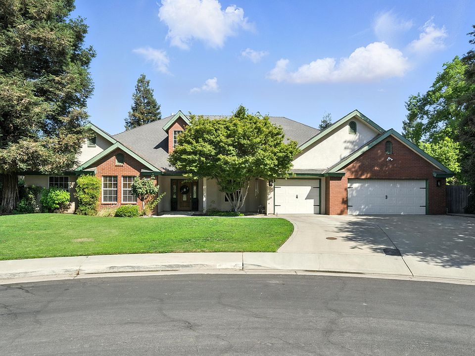 This custom-built 4 bed, 3 bath home offers both space and function, perfectly located directly across from Erling Park. Designed for both everyday family living and entertaining, you'll find a formal living room, a generously sized family room with a fireplace, and a well-appointed kitchen featuring a breakfast bar, nook, pantry, and direct connection to the main living space. Two guest bedrooms with built-in shelves and window seating share a full bath, while the expansive primary suite offers a true retreat—with a sitting area or office, fireplace, dual closets and sinks, a walk-in shower, and a Jacuzzi tub. An additional bedroom and full bath are privately situated on the opposite end of the home, ideal for multi-generational living or out-of-town visitors. The spacious laundry room includes a sink, and two newer AC units (replaced in 2019) keep the home comfortable year-round. Outside, enjoy a covered patio, sparkling pool, and built-in gas line ready for a future outdoor kitchen—everything you need to enjoy the Central Valley lifestyle.