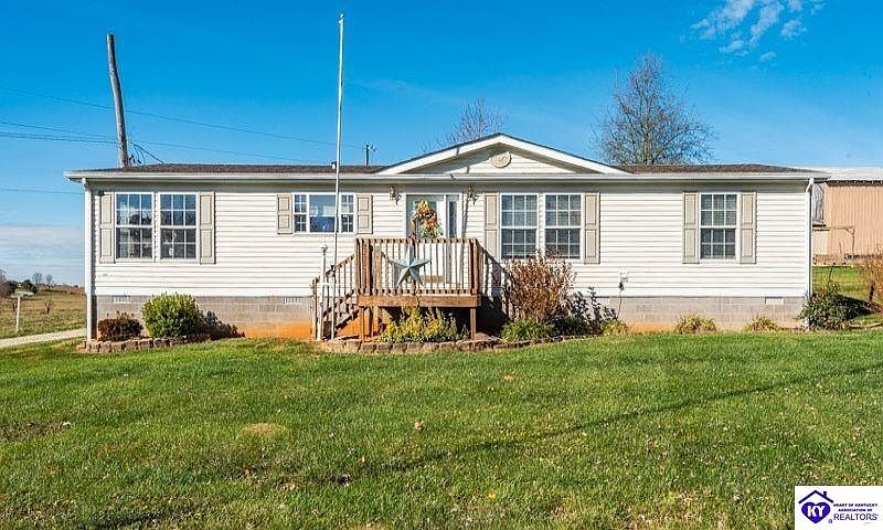 Over 5 acres!!! Welcome home to this well maintained charmer and mini farm in Rineyville. As you enter the home take notice of the open floor plan and beautiful flooring in the living room. The flooring continues into the large, primary bedroom. The bedroom also features an oversized walk in closet and plenty of bathroom space. Check out the kitchen with tons of cabinets and natural light. Combo laundry room and mud room that leads out to the back deck. Once outside you will head into the barn. The barn features 4 horse stalls, a tool room, and a tack room. Plenty of room in the loft for storing hay bales. Extra space above for storage. Horses, chickens, goats, llamas. With this much land, you can have them all here. Don't miss out on this one.