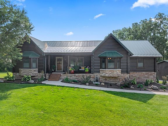 This is it! Your peaceful, little heavenly get away. Tucked away on a beautifully landscaped 1.2-acre lot, this impressive custom-built log home offers the perfect blend of rustic charm and modern comfort. Located on a quiet cul-de-sac this property is just 20 minutes from Rochester and offers school options in both Triton and Kasson-Mantorville districts. Inside, you’ll be greeted by soaring vaulted ceilings, dramatic exposed beams, cedar-paneled walls, hardwood floors, and sun-filled skylights that bathe the space in natural light. The open living room features a stunning floor-to-ceiling stone gas fireplace, pine ceilings and flooring, and walks out to a spacious 19 x 30 deck—ideal for entertaining or simply enjoying the peaceful surroundings. With 3,500 sq ft of finished space, this home offers a thoughtfully designed layout with a main floor primary bedroom retreat and private bath, main floor laundry with built-in cabinetry and deck access, and a fully finished lower level with a custom bar for hanging out with family and friends.