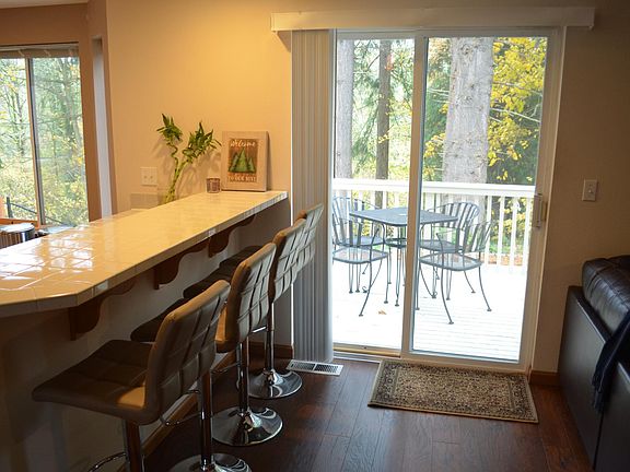 DESCRIPTION: This two-story home is fully FURNISHED and available for FLEXIBLE duration of stay. About the home: - Features include vaulted ceilings, open floor plan, large kitchen with dining nook, and master walk-in closet. - Large windows and sky lights throughout the home let in lots of natural light. - Backyard offers beautiful scenic views of forested park with natural stream. - Garage, driveway, and street parking - Part of quiet residential neighborhood, yet centrally located to shops, cafes, trails, public transportation, and more! About the furnishings: - Wi-fi internet and utilities (water, gas, sewer, garbage, electricity) are set up and billed to tenant (not part of monthly rate). - Fully equipped kitchen with all the essentials (silverware, plates, cooking utensils, glasses, ...) - Living room includes large TV with Roku and Chromecast - Fun: Ping-pong table, exercise bike, board games, books, ... - Lots of space for larger groups: 4 bedrooms and 5 beds (king, queen, full, two twins). The couch in the living room is also comfortable for sleeping and couch in the family room folds down into a sofa bed. HOUSING TERMS: Rental price is based on 1-month duration; longer lease periods will have lower monthly rate. Lease duration is flexible, may impact rental price, and subject to availability. Applicants may be required to fill an application (including credit check, employment verification, references). Upon approval, signing of the lease, first month and deposit required to secure rental. Based on application, last month may be required. Since this property is furnished, we strictly prohibit pets and smoking. CONTACT: For more information, please contact! Please include your requested rental period to confirm availability and receive a more accurate monthly rental rate. Rental price is based on 1-month duration; longer lease periods will have LOWER monthly rate. Lease duration is flexible, may impact rental price, and subject to availability. Applicants may be required to fill an application (including credit check, employment verification, references). Upon approval, signing of the lease, first month and deposit required to secure rental. Based on application, last month may be required. Since this property is furnished, we strictly prohibit pets and smoking.