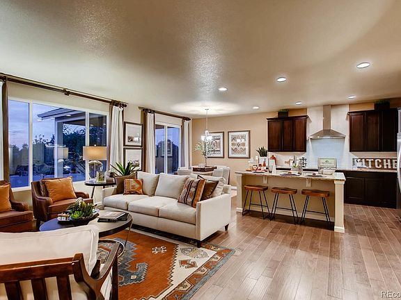 This new elegant ranch plan has engineered hardwood floors throughout the main living areas and a beautiful kitchen with 42" maple cabinets, granite counter tops, stainless steel appliances and a large island that's great for entertaining. A fireplace has been added for you to enjoy on those snowy winter nights. This home has two guest bedrooms in the front and a private owner's suite towards the back of the home with a beautiful four piece bath attached. This home is located on a corner lot in a spacious cul-de-sac adjacent to the Ute Creek golf-course. A rear covered patio and front yard landscaping are included. This home includes a fully fenced backyard as well! Photos and virtual tour are examples of the floor plan only and may showcase options that are not selected in this particular property.