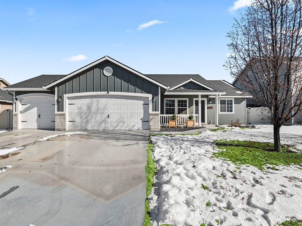 This charming single-level residence offers 3 spacious bedrooms, 2 modern bathrooms, and a versatile bonus room perfect for a home office or play space. The kitchen is a chef's delight, featuring sleek black stainless steel appliances, a gas range, and elegant quartz countertops. You'll appreciate the durability and style of the luxury vinyl plank flooring throughout. The property also includes a three-car garage, providing ample storage and parking space. Enjoy a large garden area, perfect for relaxing or entertaining guests. This pet-friendly home ensures your furry friends are welcome, and you'll love the convenience of in-unit laundry. Located just 10 minutes from grocery stores and a short four-block walk to Crimson Point Elementary. Plus, enjoy the added amenities of the HOA, which includes access to a refreshing pool. Don't miss out on making this fantastic Kuna rental your new home. Schedule a viewing today! Home does not come furnished. Includes kitchen appliances and washer/dryer for tenant use. Tenant to pay gas, power, water, sewer and trash. No smoking on site. Maximum of 2 pets allowed.