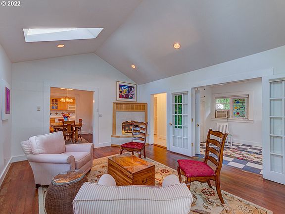 Rare offering near University of Oregon! Simply charming 1930 work of art. Covered front porch welcomes you into light-filled living room with vaults, skylights, wood floors & refurbished gas fireplace. Formal dining. Bright kitchen with tile & plenty of cabinetry. Front bedroom with French doors could be office. Guest quarters with greatroom, loft bedroom, bath, separate entry or interior, parking. Private back deck to enjoy sunny mornings. Raised beds & lovely landscaping. South Eugene schools