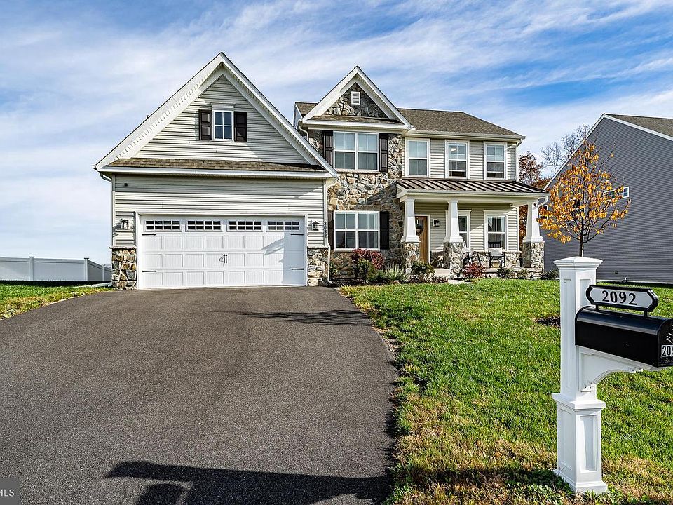 Welcome to 2092 Prout Farm Rd situated on a premium lot in the desirable Sprogel's Run community This 4 year old Craftsman style 4 bedroom, 2 1/2 bath single-family home is available for immediate possession. One of the first things you will notice is the beautiful stone facade and covered front porch adorned with craftsman style columns and metal roof. Upon entering the home you can't help but notice the gorgeous engineered hardwood floors and stairway, high ceilings with bright recessed lighting that carries throughout most of the main floor. To your left you will see an elegant dining room with a warm detailed accent wall. To the right of the foyer, is a nicely sized office as well as a half bathroom. Natural bright light and breathtaking views cheerfully greet you in the family room and open concept kitchen. This designer transitional kitchen is truly a chef delight, blending both traditional French Country features and the modern farmhouse feel. Featuring Quartz countertops, under mount sink, oversized island, stainless steel appliances, custom cabinetry, glass lit transom, crown molding, subway tile backsplash, and the list goes on. In addition, your eyes are drawn to the large triple window showing off the panoramic views behind the home. Opening to the family room, with another set of triple windows with elegant plantation blinds, and again a majestic view complete with a brand new oversized trex deck. A propane gas fireplace, centers the room perfectly. Finishing off the main level is the magnificent primary bedroom, recently added sisal carpet with a detailed feature wall and en-suite. His and hers walk in-closet, dual vanity, separate shower, and free standing soaking tub, and beautifully tiled flooring. Moving upwards the second floor boasts a large open loft area. Completing the second floor are three generous sized bedrooms each with a walk-in closet and full bath with double vanity. A huge heated walkout daylight basement that offers plenty of storage and is just waiting for your finishing touches, including a rough in for half bath. This absolutely flawless professionally painted home full of upgrades and a neutral decor can rival any new construction model home, with a quick delivery timeframe at a price you can't beat! This one is likely to sell quickly.