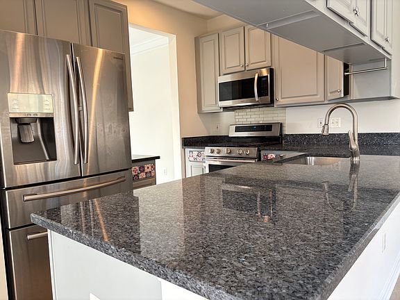 Modern kitchen featuring granite countertops and stainless steel appliances