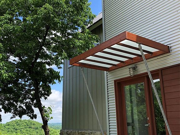 One of a Kind Custom Home: 4 bed, 3 bath, open concept with guest suite. Sitting on a bluff overlooking the Verdigris River valley and hills, this Architect's home includes high volumes with exposed wood trusses and 160-year-old reclaimed wood flooring. A custom 15'x15' window provides views of the forest. Features include H/E heat pumps and solid-wall insulation. Sale price includes the Adjacent 1.67 acre lot, for a total acreage of 3.59 M/L.