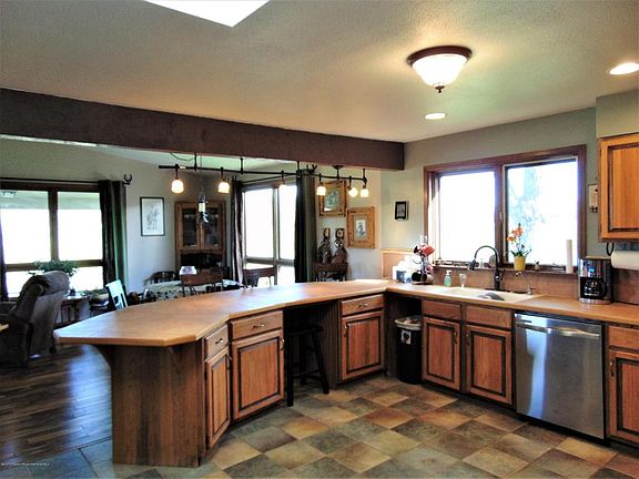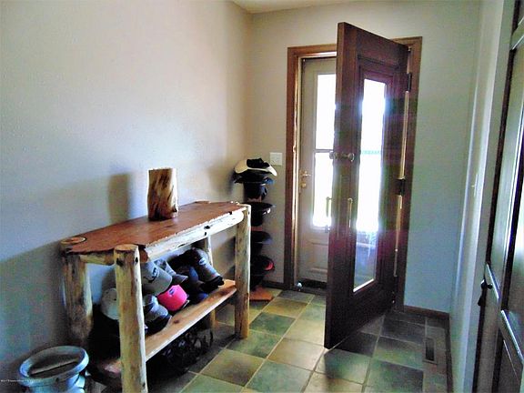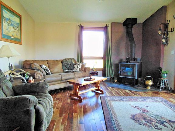 Beautiful stucco home with amazing views and beautiful sunsets. Sits up high and over looks the pond and green pastures.Has adorable landscaping with sprinkler system. Multiple buildings include, large Shop, Barn, and an Office. Every ranchers dream in one of the most scenic areas. Great hay production and water.Property has Grandfathered Kennel.1250 shares of New Multi Trina Ditch StockWell Number 256912