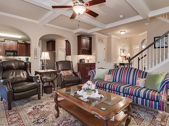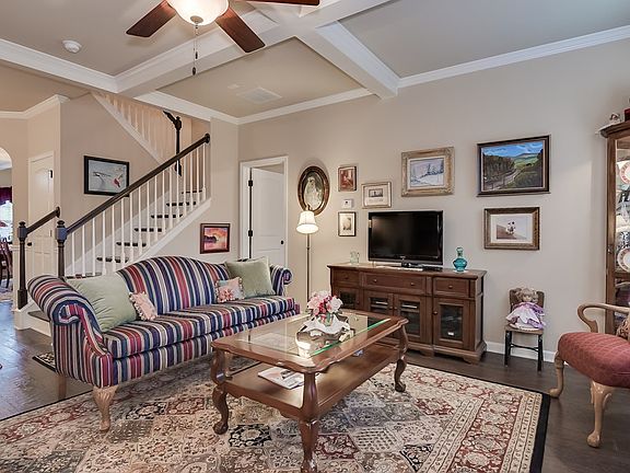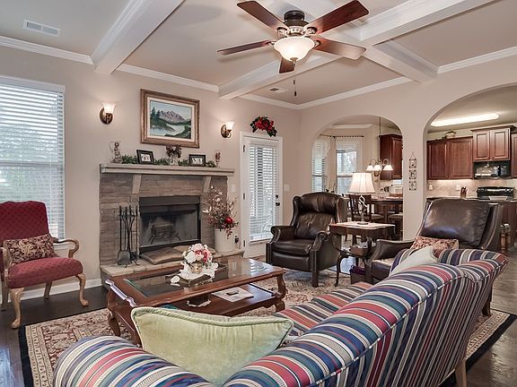 This handsome home in Hawk's Ridge is fantastic inside and out. Loaded with upgrades, it's better than new! Beautiful ceilings with coffered detail, wainscoting, arched doorways, wood burning stone-faced fireplace, hardwood floors...all in pristine condition. Desirable Gentry floor plan is open and flowing with clearly defined living spaces. The kitchen has granite counters, cherry cabinetry, wine bar and desk area plus a large pantry for storage. Speaking of storage...this home has tons of big closets, most of which have upgraded systems. The master suite on main floor features a huge bath with spacious tiled shower, jetted tub and double sinks. Upstairs has lots of flex spaces for office, art room, media room in addition to the bedrooms. Vaulted ceilings are a key feature - paint colors and finishes are harmonious and consistent throughout. The yard is beautifully landscaped, has a large, privacy fenced backyard and storage building. Lots to love, easy to live your Best Life here!
