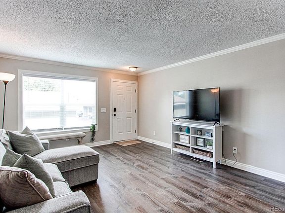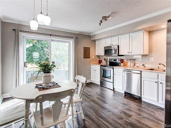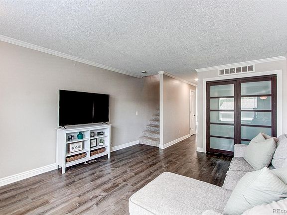 Stunning 2 bedroom, 2 bathroom townhome with views; backing to an open lot with updates throughout and on trend colors, style and finishes. The main floor features newer luxury vinyl floors through out, fresh paint, large family room, crown molding, dedicated dining space and a large kitchen with white cabinets, stainless steel appliances and tons of counter and cabinet space. The kitchen leads to a private fenced backyard space with large patio, mature trees, astro-turf grass, mountains views and open to a large residential lot which provides tons of privacy. The upper floor and stairs, has newer carpet, crown molding a large primary bedroom and oversized walk-in closet, very spacious secondary room with stylish accent wall and exceptional mountain views. Other key features include newer central AC, updated lighting throughout, black door hardware, craftsman style doors, designer floor and door trim, Low HOA fees, carport and 1 additional reserved parking space and ample guest parking. Located just minutes to the historic downtown area of Castle Rock, endless trails, locals parks, dog park and quick access to I-25. This home is well loved and well priced and shows amazing.