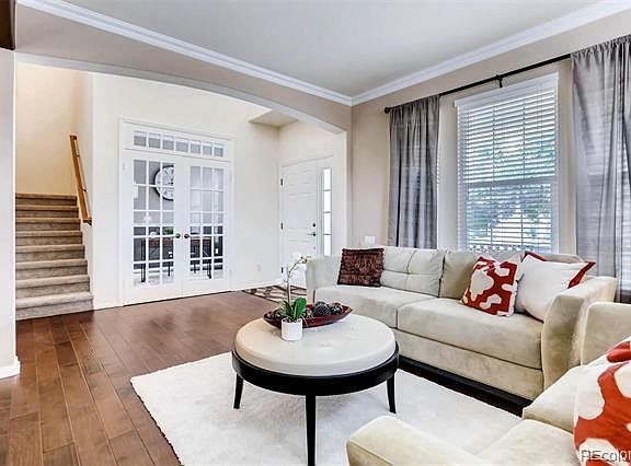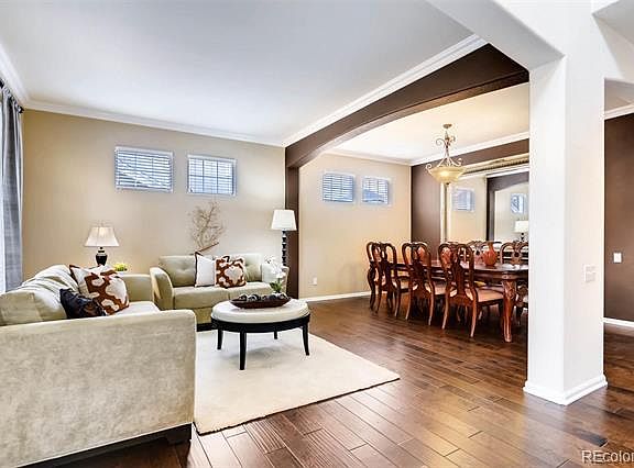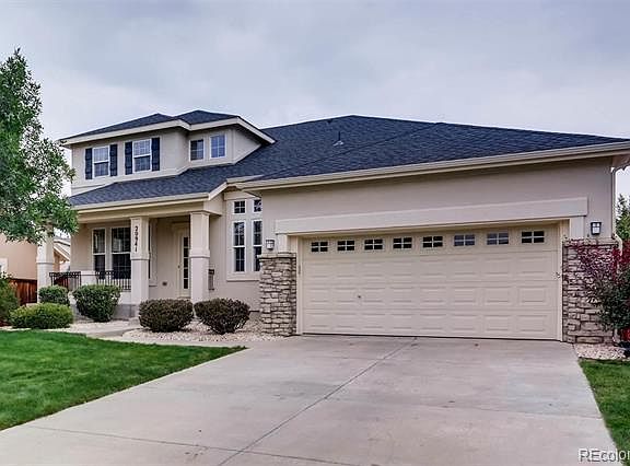 Spacious, open floor plan, 2 story house with main floor mater! 5 piece master bathroom. Beautiful wood floor throughout the main floor. Study/office with french doors on main floor. Three large bedrooms and new carpet upstairs. Flat, large backyard. New roof. 3-Car garage has built-in work station, faces south-snow melts faster in winter! Unfinished large open basement. All appliances included. HOA dues include access to community pool that has kiddy pool and a club house to hold personal events. Walking distance to school, trails and parks. Easy access to DIA, E-470, VA and Children's hospitals, Southlands mall,Buckley Air Force, restaurants and shops. Move-in ready.
