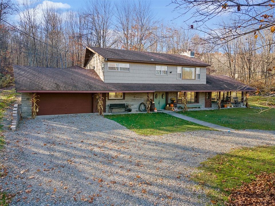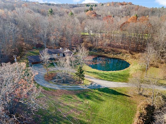 Private get-away on 23.4 acres! Lots of updates in this unique custom home. Outside enjoy the stocked pond, hiking trails, hunting, newer hot tub, large back deck and firepit area. The first floor offers a large living room with a custom wet bar which can also be used as a second kitchen, 1st floor also includes large family room, bedroom, laundry and full bathroom. All of which can provide a single level living option. Second floor includes master bedroom, updated full bathroom, updated kitchen and large bright living room.