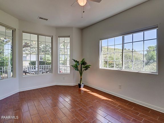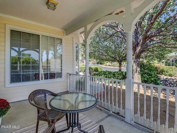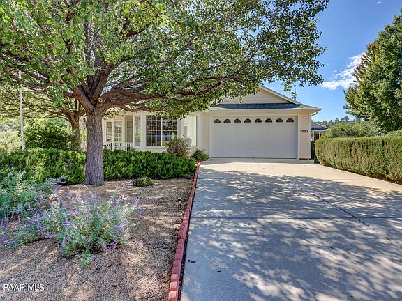 Home has one of the LARGEST and most PRIVATE lots in this desirable community. VIEWS of Bradshaw Mt, Mingus Mt and Rose creek. It also backs to Town of Prescott Valley open space. Very quiet and so peaceful as you watch the deer and the many birds. NEWER ROOF 2017 and EXTRA LONG DRIVEWAY.  This King George model is STICK BUILT 2 BD home with split floorplan and a flex space area. The kitchen features ample knotty pine cabinets. Home has fresh paint & carpet, ready for you to add your personal touches. Home is priced below appraised value to sell NOW. Last contract cancelled due to buyer's financing.