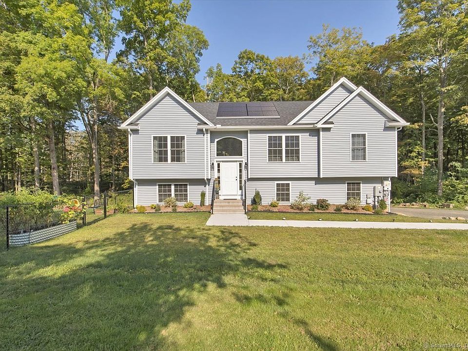Rare opportunity to own a beautifully maintained, nearly-new construction home in the Long Hill Estates subdivision. This elegant raised ranch sits on a 1-acre, lightly wooded lot and features a walkway leading to a front entry that offers access to both the main level and a finished lower level walk-out. Inside, enjoy a spacious open floor plan bathed in natural light, with cathedral ceilings and hardwood floors. The designer kitchen is a highlight, featuring a large center island, quartz countertops, and cabinetry with dovetail joints and soft-close mechanisms. Sliders from the dining room open to a composite deck overlooking a fully fenced backyard. The main level also includes three bedrooms, with a master suite offering two closets and a full bath, plus two additional bedrooms with wall-to-wall carpeting and a second full bath. The versatile lower level offers an additional 1,297 SF of finished space, with a family room with a sleek epoxy concrete floor, a half bath, and French doors leading to a patio, while the converted garage space provides an ideal home gym or recreation room with direct access to the parking area. Additional amenities include Solar (Buyer to assume solar panel Agreement), propane gas heating, central A/C, and city water. Conveniently located near major routes, commuter rail, top-rated schools, the town beach, parks, and the historic town green, this exceptional home offers unparalleled value and comfort. First floor/lower level offers 1,297 SF, while the main floor offers 1,347 SF, for a total of 2,642 SF (see floor plans).