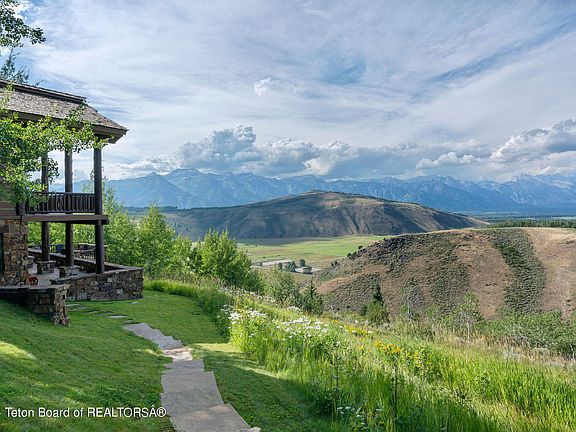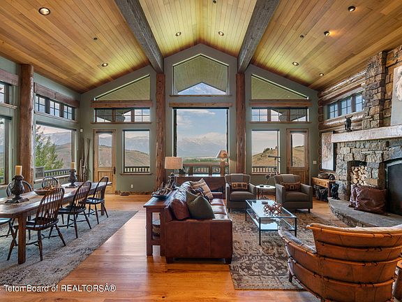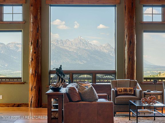 This exceptional home, nestled on a tranquil cul-de-sac at a prime 3.71-acre lot, offering the most breathtaking views of the Teton Range that Spring Creek Ranch offers. Spanning nearly 5,100 square feet, this residence features 5 bedrooms and 5.5 baths, each bedroom enjoying its own ensuite. The inviting main floor seamlessly blends the kitchen, living, and dining areas under soaring vaulted ceilings, with expansive windows framing stunning panoramas of the Grand Teton and the surrounding valley.