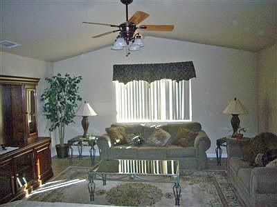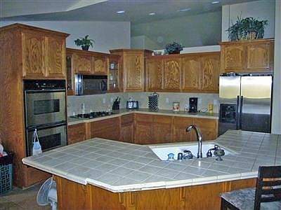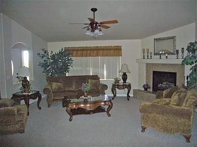 This is an outstanding former model home on a half acre corner lot, with 3 bedrooms, 2 baths, with 2367 SF interior space. It is in turnkey condition. It has an open design. The kitchen has stainless steel appliances and an island with sink and dishwasher and upper and lower cabinet lighting. The living room is separate from the family room with custom enclosed fireplace. There are custom ceiling fans throughout, an indoor laundry, 3-car garage, large driveway and RV access, covered portico, landscaped front yard with sprinkler system, fenced back yard, and custom tiled roof.