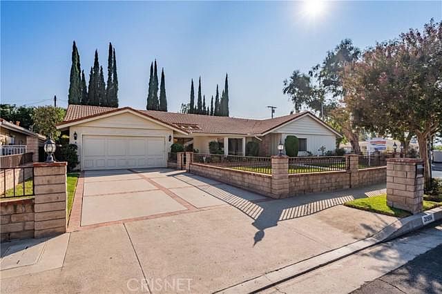 Rare find in one of the nicest areas of Chatsworth. Huge corner lot (nearly 11,000 ft. flat) with front mountain view, double cul-de sac, custom brick/block gates surrounds the grassy front yard. Enjoy oversized 2 car garage with direct access to home and additional gated entrance on West side of property allows space for more cars, RVs or off road vehicles. Spacious footprint with all the room you need for entertaining and family. Front Double door entrance gives way to tiled foyer - Open floor plan with Step down living room, which leads to huge formal dining room with sparkling crystal chandelier and discreet access to Kitchen. Beautiful sun filled Family room with floor to ceiling stone fireplace and custom oak bar with double door sliders overlooking backyard. Features cooks kitchen w/generous tiled counters and many rich oak storage cabinets, drawers and pull outs, built in fridge, double oven and secretary, window over the sink and additional access to rear patio/yard through another set of double door slider. Oversized dining area and center counter with pass through Direct access from garage in through kitchen mud/utility room, with more storage, side by side washer/dryer (included), additional sink and access to rear yard. West wing houses the 4 beds and 2.5 baths - Enjoy 3 big bedrooms with walk in closets, Primary features Double door entry w/ cathedral ceilings, windows and sliders provide access and views to the pool and rear gardens - elegant primary bath with step down tub, separate stall shower, double vanity - feels like a grand hotel. The well manicured rear yard features custom pruned hedges, roses, fruit trees and deck areas for lounges, tables and chairs - built in fire pit and BBQ center with custom brick accented patio frames large sparkling pool and jacuzzi - mature trees along property perimeter offer privacy but still allow plenty of sunshine. Room to entertain, play and lounge. New carpet, tiled roof, HVAC, Copper Plumbing -More storage in garage. Start living the good life and plenty of room to do it.