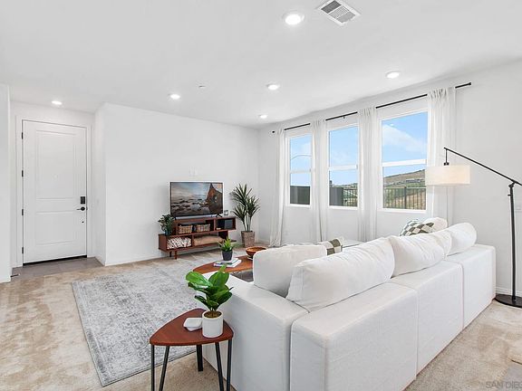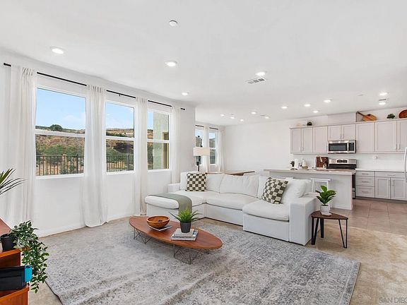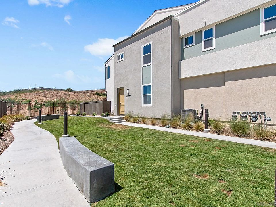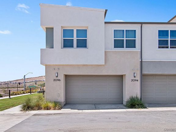 Welcome to this beautiful Cota Vera townhome nestled in the highly sought-after Trevi community! This end unit boasts the best location with an attached two-car garage and a nicely sized backyard featuring pavers and turf, offering privacy with no neighbors behind. Built in 2023, this home still feels brand new with an open floorplan, paid-for solar, and recessed lighting throughout. The gourmet kitchen is a chef's delight, featuring quartz countertops, a custom backsplash, and an island with breakfast counter seating that seamlessly opens to the living area. The main floor includes a convenient bedroom and full bath, while the spacious primary suite upstairs offers a walk-in closet and its own en-suite bath. Trevi residents enjoy access to a children's park next door at Bluestone and resort-style amenities including a sparkling pool and a dog park. The community is home to beautiful parks and is just minutes from Olympian High School, Wolf Canyon Elementary, and Otay Ranch Town Center, with a variety of restaurants and easy access to Interstate 125. Don't miss this opportunity to live in one of the most desirable areas of Chula Vista!