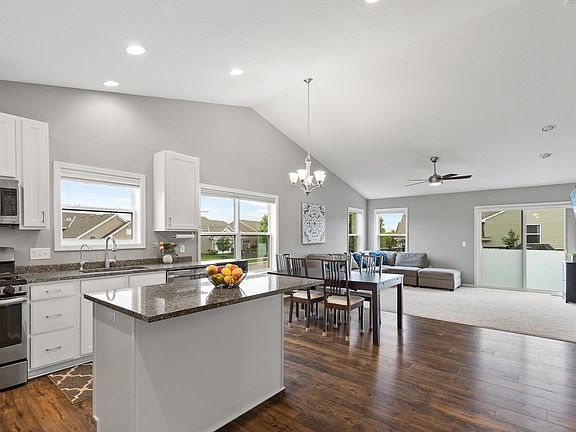 This stunning, well-maintained Cal Atlantic three-level home features a fusion composite deck, patio, inground sprinkler system, and an insulated garage with openers for all three stalls. The interior boasts granite countertops in the kitchen and upstairs vanities, a Ketika whole house water system with reverse osmosis, and a dual-stage Lennox furnace with a humidifier, smart thermostat and room sensors. The kitchen includes a center island with select soft-close drawers and roll-out pantry, stainless steel GE appliances, upgraded Mohawk laminate floors, and three-panel colonist white painted doors. The desirable open floor plan has a vaulted ceiling leading to a large deck with a view of the tree-lined, fenced yard. The owners' suite includes a walk-in closet and a private ensuite bathroom with his and her sinks. The finished walkout basement offers both a recreational room and a bedroom, which open to a stone patio and fenced yard.