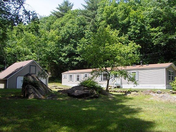 Affordable living just a stone's throw from Lake Todd and on the way to Mt. Sunapee yet you can walk to Dunkin' Donuts for a morning coffee! Single-wide manufactured home in good condition with a great floor plan. Large living room and open kitchen/dining area with slider to back deck. Laundry room off kitchen. Master bedroom suite on one side with closet and bath with soaking tub and a shower. The other side features two more bedrooms and a full bath. Detached heated 2-car garage with storage area above for all the toys or a workshop. Second open shed. Nice yard, gardens, tucked off the road and sited on 2.9 acres. There is also a wonderful building site up on a knoll that you can access going around back should you wish to build a home one day down the road.