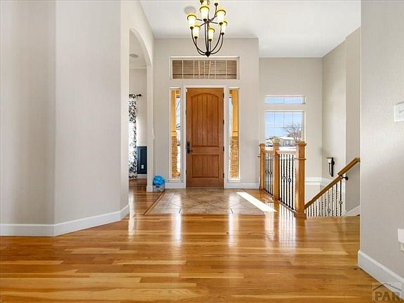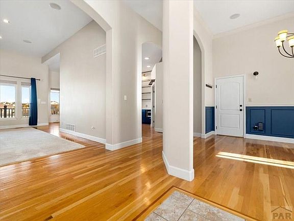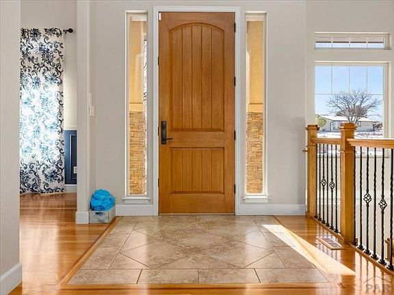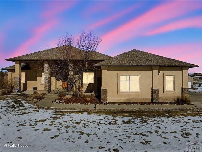 Executive Style Rancher with FULL finished walkout basement, with no window wells. Everything is upgraded. This home features a Culinary Kitchen with High-End GE Cafe Appliances along with copper faucets, lighting, cabinetry hardware, and fixtures. Beautiful hardwood floors on the main level complement the formal dining room along with arched designs, cathedral-height doorways, and ceilings. Quartz countertops in the kitchen, with a large island, and the bathrooms have granite. Beautiful master suite with luxurious bath, walk-in double shower, rain shower, and bidet water closet. The Jack and Jill bedrooms have a beautiful walk-thru shared bath. A half-bath is on the main level for your guests. The basement is fully finished and boasts stone pillars and a beautiful gas fireplace. There is a second kitchen and theatre here which makes this perfect for entertaining or possibly an ideal mom-n-law quarters. There are two bonus rooms with so many options; a homeschool classroom, a gym, an office, just so many possibilities. The property has a fenced backyard and is landscaped nicely. This is a corner lot and the lot behind is also available with the Pueblo West bridal trail behind the lot. Oversized 3 car garage with a stainless steel sink & shelving. A 30x40 Cleary Building with Tall Doors and a 12x20 Tuff Shed. Tremendous Pike's Peak mountain views. And the bus stops at the corner of this property.