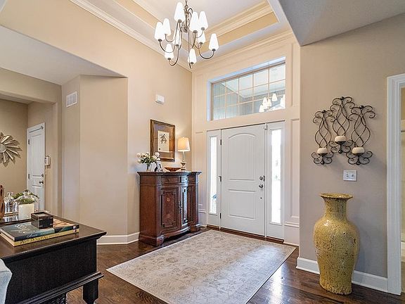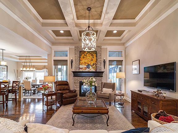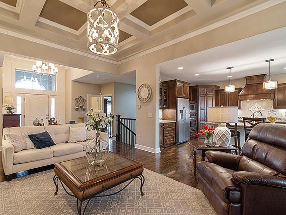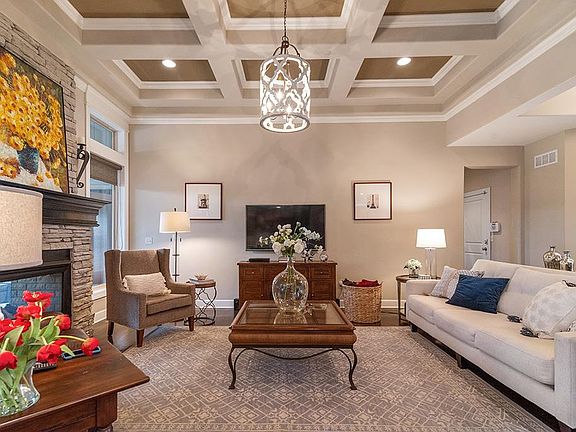 Luxurious 1.5 story w/walk-out basement. 2 beds & 2 full baths up, 2 beds & full baths down. FORMER MODEL still feels brand-new! Fabulous kitchen finishes w/granite & stainless appliances, GAS range, walk-in pantry, breakfast bar perfect for entertaining. Stunning tray ceilings in entry, great room & dining. Floor to ceiling stone see-through fireplace in great room to sun room. SUN ROOM to enjoy YEAR AROUND w/screens, windows, dedicated HVAC, ceiling fan, fireplace & TV. Stone & granite bar in rec room downstairs